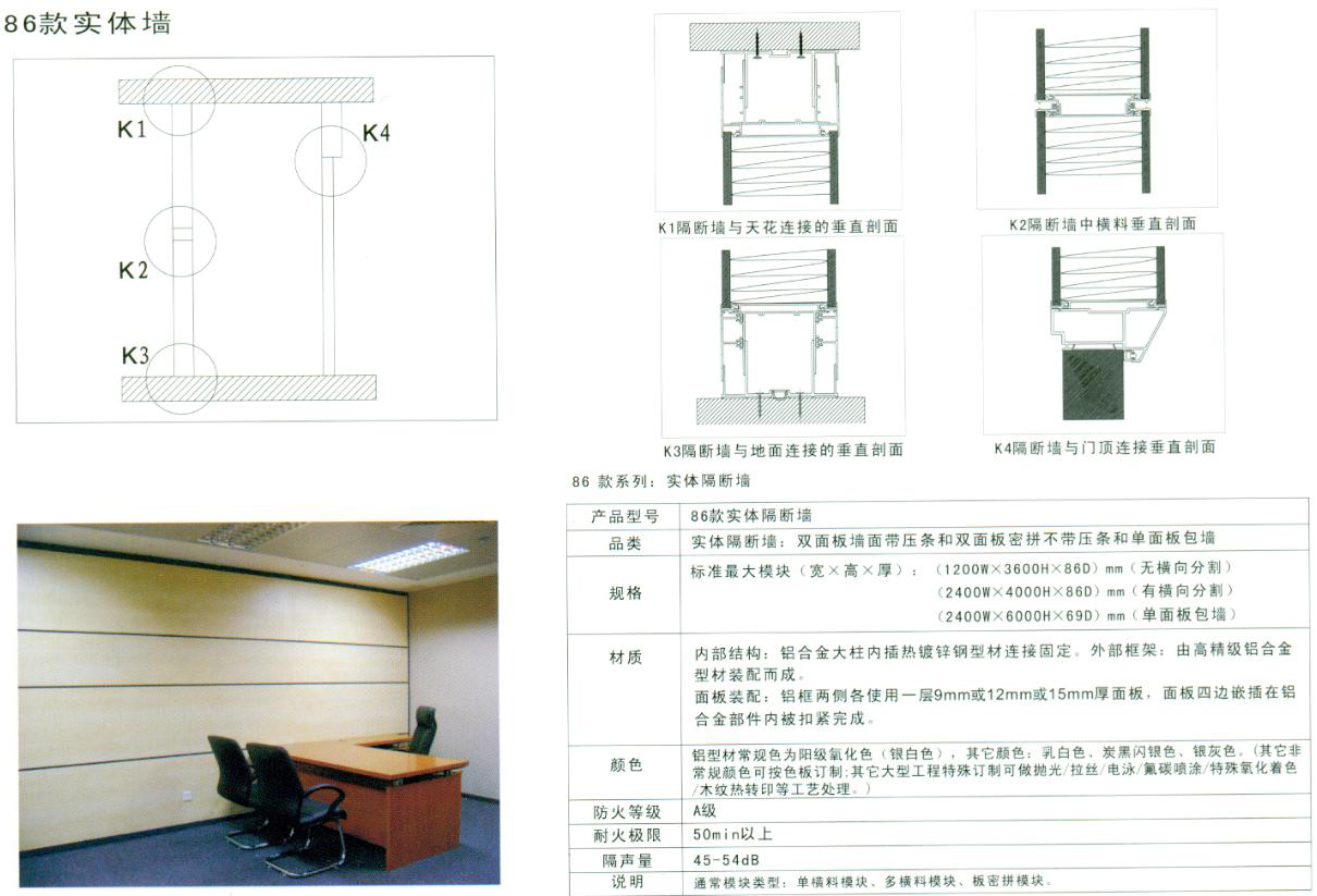 86款双面高隔断特点: 1、86款百叶帘(跨度为1.3米)的无透光设计,使得私密空间更加严密。(如图1、图2) 2、横向压条为17mm,使得空间增强规整性,同时具有强大的吊挂功能,可吊挂荷载100KG,提升室内垂直空间使用率;竖向压条为13mm。整支的竖压条设计,避免了面板与面板拼缝的缝隙不均、不美观以及声音易从缝隙中直接传递的困扰。既美观大气,又增强了隔音功能。(如图3) 3、踢脚板为外盖式安装,拆卸方便,美观且便于线路维修。 4、双面可采用不同厚度的面材,双板材隔墙中内置约70mm厚隔音棉,从物理声学原理上也使隔音效果更好!(如图4)