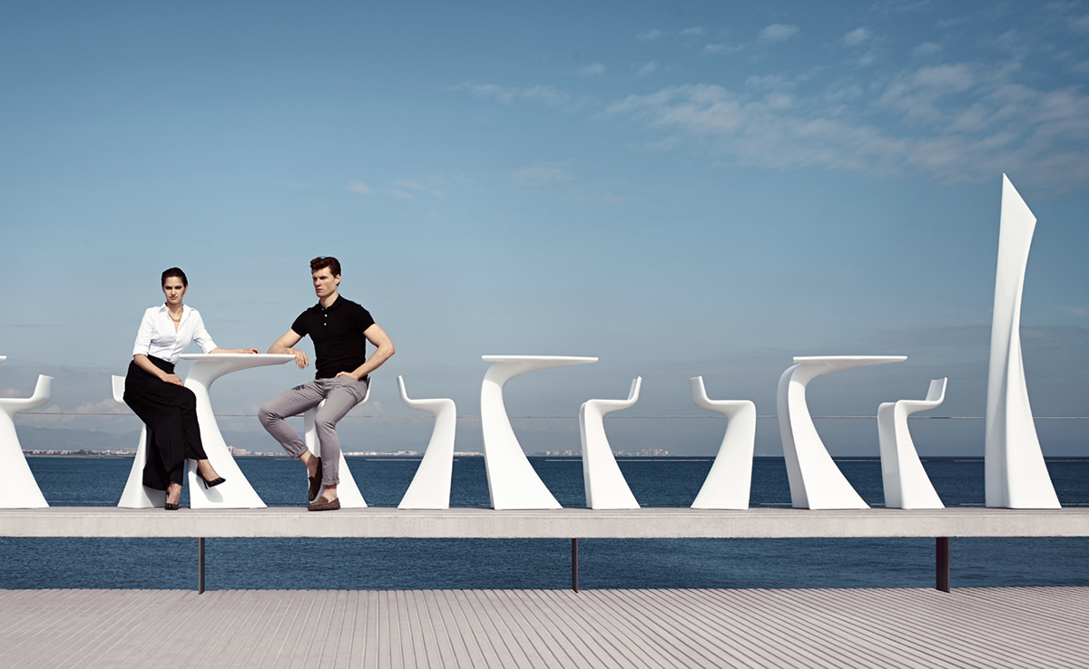 "翼系列包含翼台和翼吧凳,由设计大师oaquín Torres和Rafael Llamazares设计,它造型以一种动态的方式将直线和曲线编织在一起。这些极端曲线和角度,在最新的体系结构中,已经达到了家具设计典范,通过运用自由的、 微妙的、 有机的线条,以运动的形态,分离本身刚度。这些都是大胆的创新,构成了巨大的视觉冲击,令人印象深刻,达到雕塑和动态意义。"