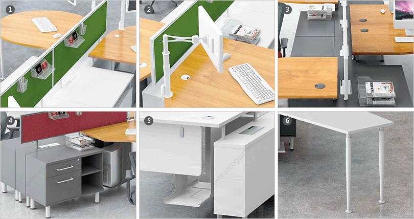 | 1、桌面屏风,多种选择:板材、玻璃、亚克力、吸音板、多功能挂槽; | 2、电脑屏幕支架。 |