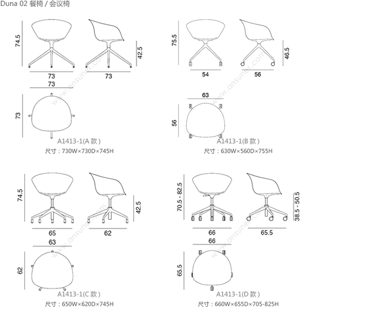 Duna 02 餐椅/会议椅 系列尺寸/示意图