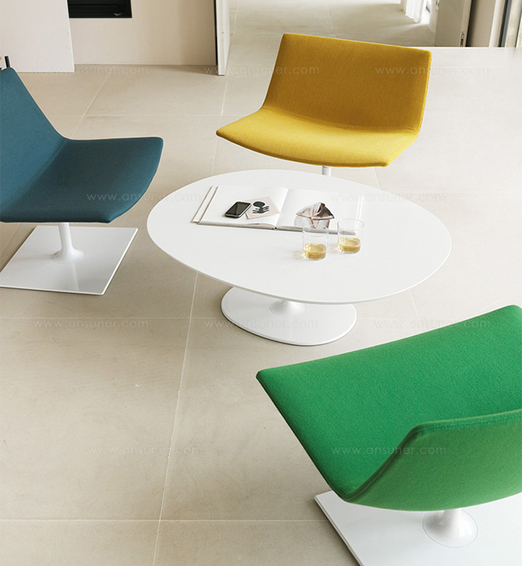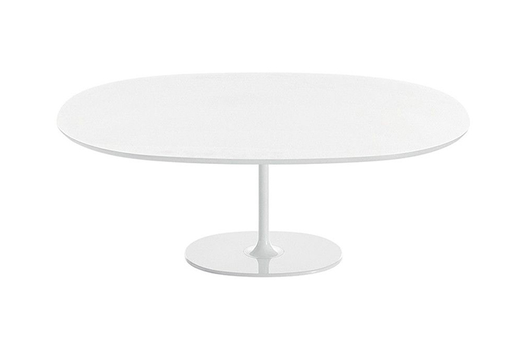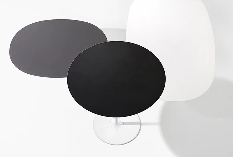 咖啡桌为椭圆形底座,白色有光泽或黑色哑光粉末涂层钢,顶部为白色压花MDF(厚2.5厘米)或层压板FenixⓇ(厚2,6厘米),有不同尺寸可供选择。 身高35厘米。