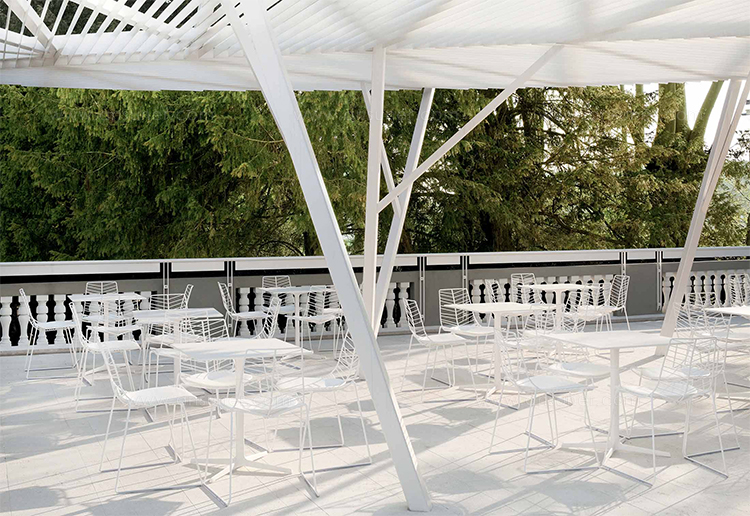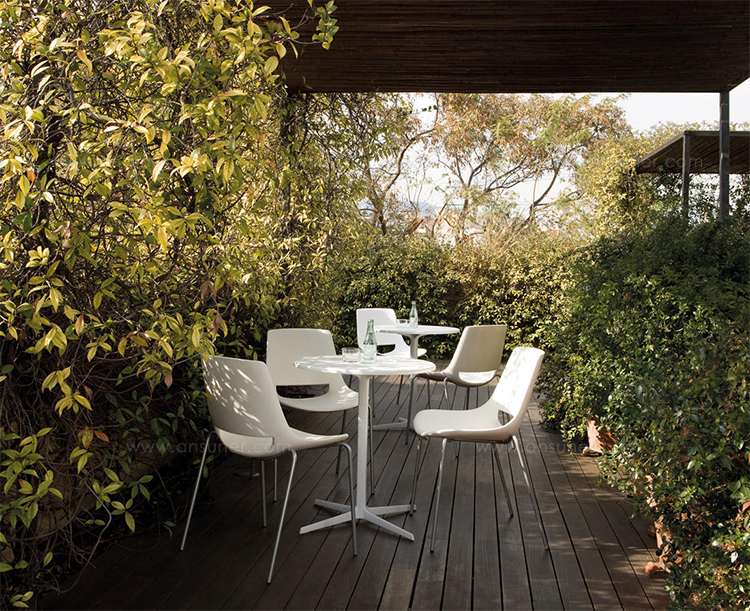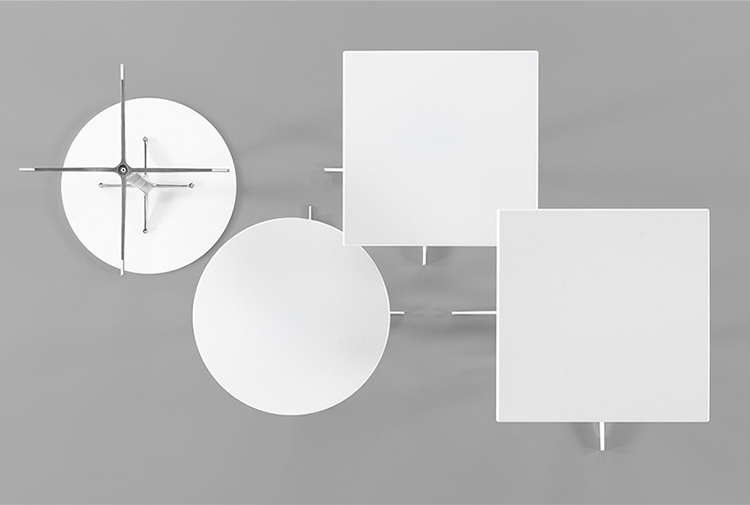 有四种高度(36.4,50,74和105厘米)可供选择,圆形和方形顶部有各种尺寸。 四星级底座采用闪亮或白色涂层铝制成。