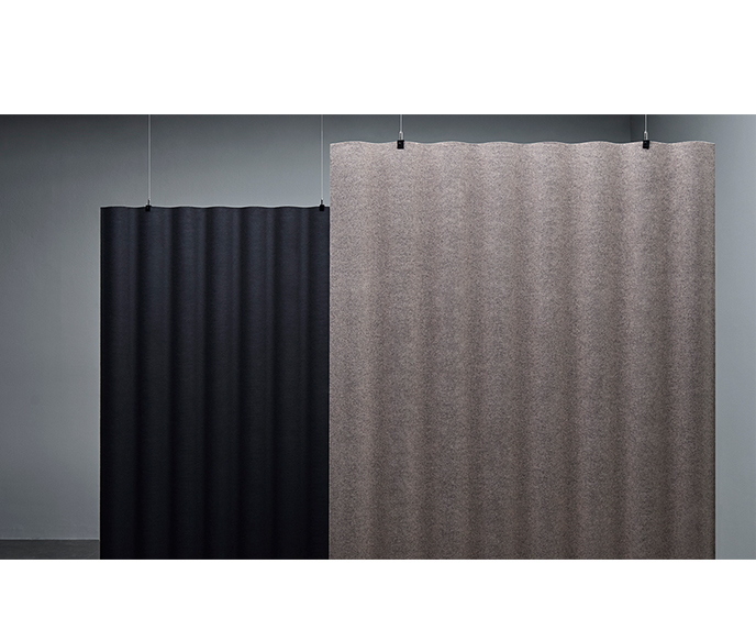 吊顶式可配备集成照明,白色或黑色染色灰。Scala 100%可回收。该面料经欧盟生态标签认证。