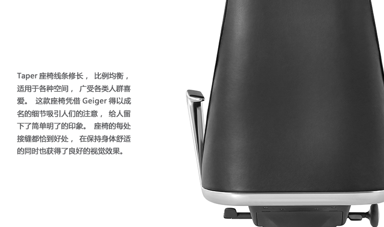 作为一款主管椅,Taper能提供同等优异的质感、舒适性和性能,让商业领袖们可以体验到与驾驶豪华汽车上班一样的愉悦感。该款产品提供了优秀的舒适和性能体验,充分代表了Geiger更高的质量和制作水平。