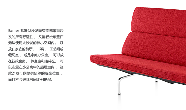 Eames紧凑型沙发既有传统笨重沙发的所有舒适性,又能轻松布置在无法使用大沙发的狭小空间内。以放在家庭的前厅、书房、工艺间或缝纫室,或是家庭办公室。可以放在行政套房、休息室和接待区。可以布置在小公寓中的起居室内,这款沙发可以提供足够的就坐位置,而且不会破坏房间比例搭配。