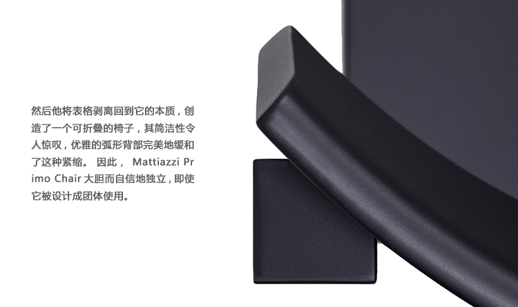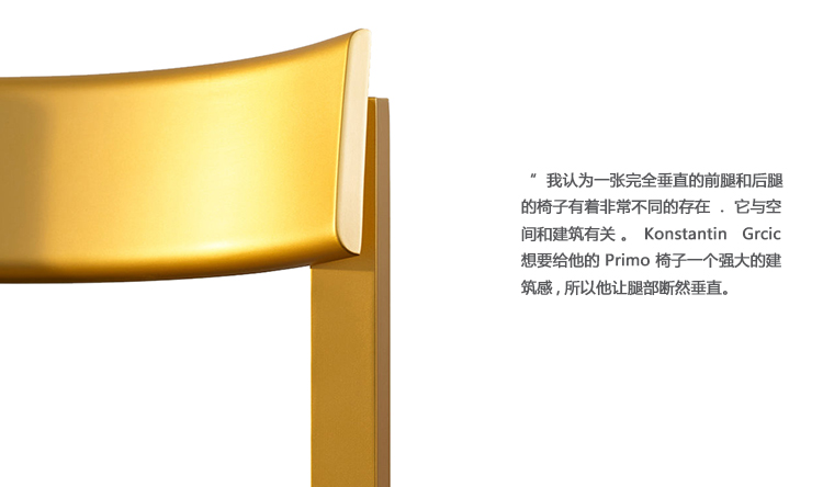 “我认为一张完全垂直的前腿和后腿的椅子有着非常不同的存在。它与空间和建筑有关。Konstantin Grcic想要给他的Primo椅子一个强大的建筑感,所以他坚定地使腿垂直。然后,他又把它的形态剥回了它的本质,创造了一个简单而又令人叹为观止的可堆叠的椅子。优雅的曲线完美地反映了这种紧缩。其结果是,Mattiazzi Primo Chair独自站立