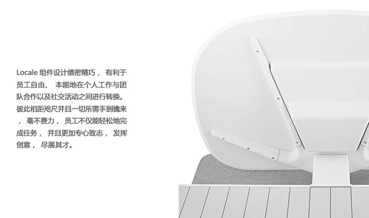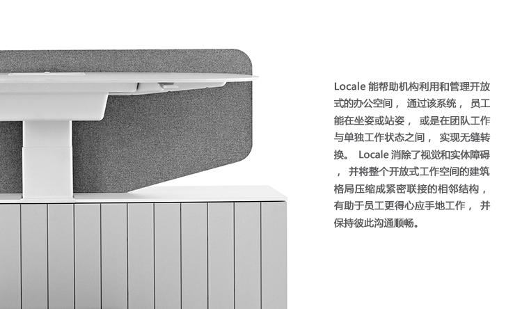 Locale能帮助机构利用和管理开放式的办公空间,通过该系统,员工能在坐姿或站姿,或是在团队工作与单独工作状态之间,实现无缝转换。Locale消除了视觉和实体障碍,并将整个开放式工作空间的建筑格局压缩成紧密联接的相邻结构,有助于员工更得心应手地工作,并保持彼此沟通顺畅。