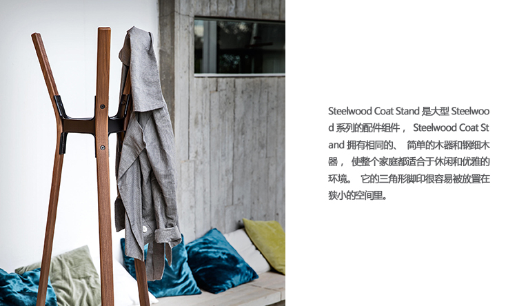 Steelwood Coat Stand是大型Steelwood系列的配件组件,Steelwood Coat Stand拥有相同的、简单的木器和钢细木器,使整个家庭都适合于休闲和优雅的环境。它的三角形脚印很容易被放置在狭小的空间里。