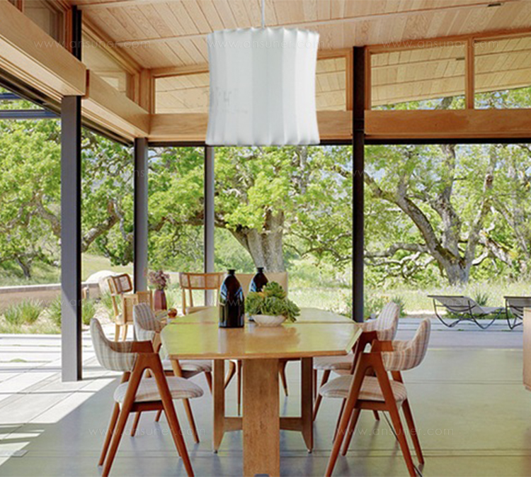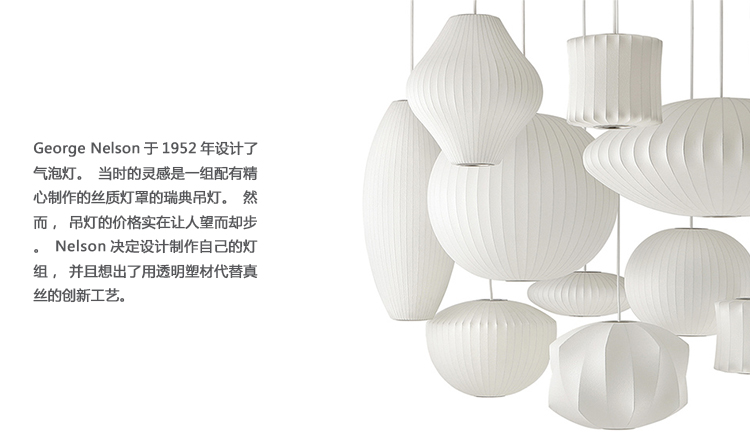 Nelson Lantern Bubble Pendant灯笼气泡吊灯对传统灯罩简洁优雅的造型进行了一定改造,使其更有现代风格,可以通过一条6英尺的吊绳和吊线板悠然悬吊在头顶。George Nelson于1952年设计了气泡灯。当时的灵感是一组配有精心制作的丝质灯罩的瑞典吊灯。然而,吊灯的价格实在让人望而却步。Nelson决定设计制作自己的灯组,并且想出了用透明塑材代替真丝的创新工艺。