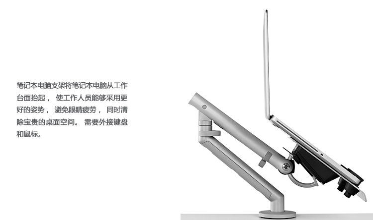 笔记本电脑支架将笔记本电脑从工作台面抬起,使工作人员能够采用更好的姿势,避免眼睛疲劳,同时清除宝贵的桌面空间。 需要外接键盘和鼠标。
