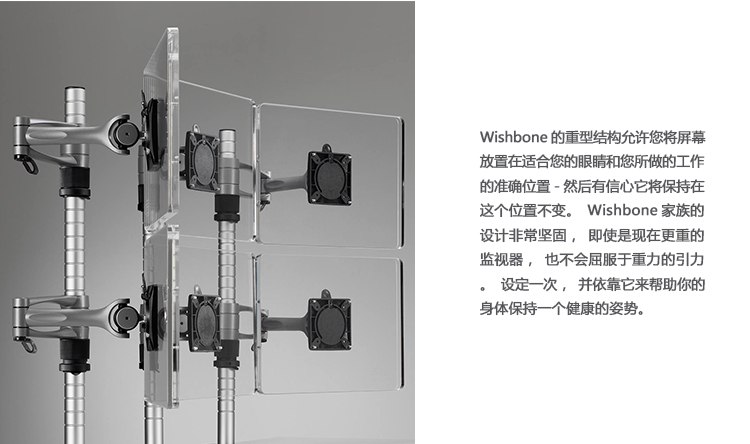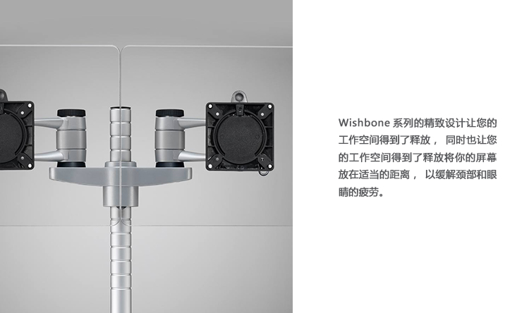 Wishbone系列的精致设计释放了工作台面上的空间,同时允许您将屏幕定位在适当的距离,以缓解颈部和眼睛疲劳。