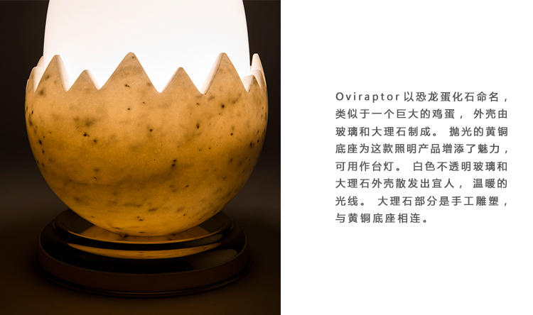 Oviraptor以恐龙蛋化石命名,类似于一个巨大的鸡蛋,外壳由玻璃和大理石制成。抛光的黄铜底座为这款照明产品增添了魅力,可用作台灯。 白色不透明玻璃和大理石外壳散发出宜人,温暖的光线。 大理石部分是手工雕塑,与黄铜底座相连。