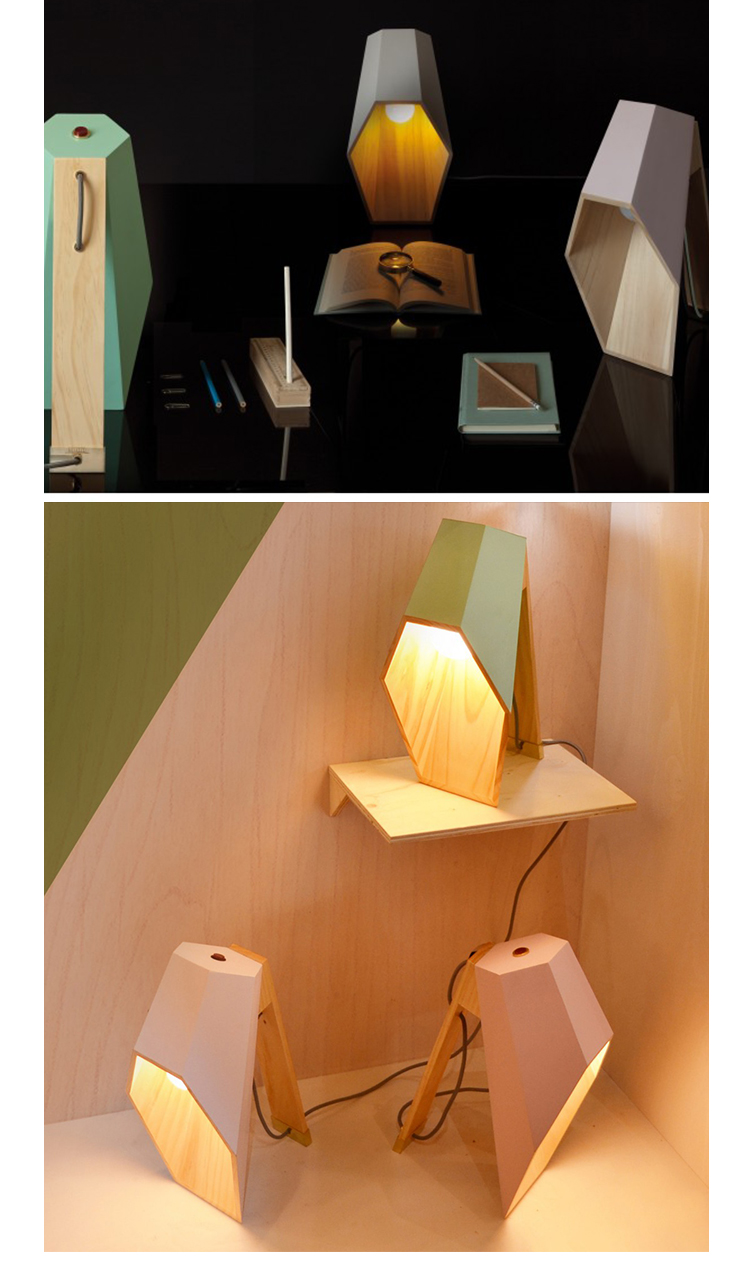 Woodspot是一盏台灯,灵感来自Rene Magritte的“光明帝国”。该设计由一个底座和一个类似引擎盖的透光器组成,它提供了一种让人想起路灯的聚光灯,就像马格里特世纪中叶的油画中所看到的那样。木制的底座是用松木手工制作的,用天然油完成。扩散器采用白色或粉彩粉红或绿色漆,可与高达60W的灯泡一起使用。