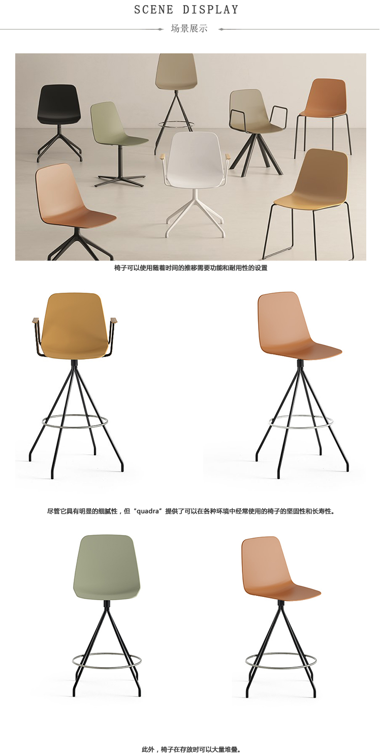 这种新的椅子的版本保持菱形的座椅是自2012年以来在该系列中看到的Maarten系列的特征。增加的功能包括各种基座(四条腿,雪橇,旋转,金字塔,轮式......),并且可以选择堆叠其中一些,非常好共享空间的附加价值。
