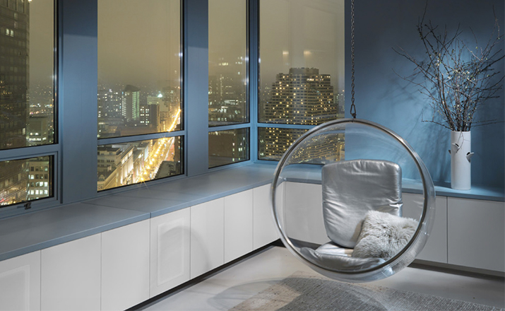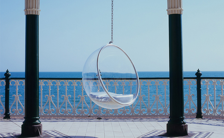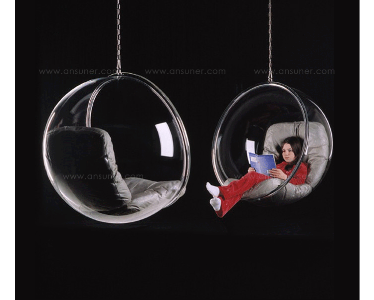 "芬兰家具设计大师艾洛.阿尼奥(Eero Aarnio)在德国品牌Adelta的代表作Bubble Chair(泡泡椅)。灵感来自于Ball Chair,但尺寸略小,而且椅子是以压克力制成,光线可以从四面八方透进。压克力加热充气,使它成为皂泡状,加入一个钢圈和椅垫即成。这样一组貌似轻巧的家具,但却能负重至少200公斤以上,由天花板垂链将Bubble吊起,宛如漂浮于空气中的泡泡一般!洁净面透明!带着科技感的椅子,又像置身于太空中,未来感十足。摆脱了椅子就是要放在地板上的刻板印象。最适合为摄影背景之用。坐在这把椅子上,即使身处一个拥挤的空间,也有点遗世独立的奇妙感觉。挪威一家电话公司在总公司入口大厅吊了几把这样的椅子,让客户可以在打行动电话时,有个宁静的空间。这件作品在1966年的科隆家具博览会上一举成名。