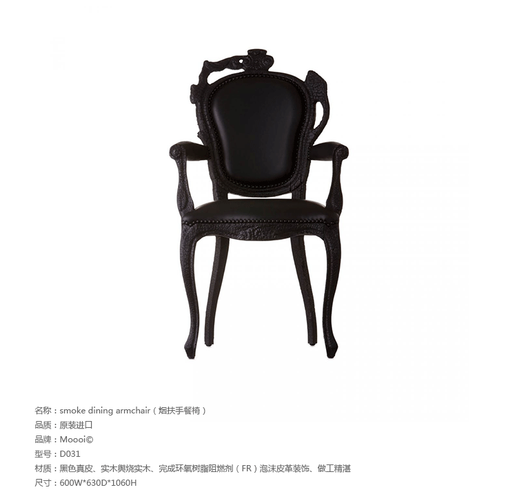 "Pieces of furniture are literally burned,after which they are preserved in a clear epoxy coating.The beauty and character of burned wood is now captured in a long lasting material, creating the strange sensation of sitting on burnt furniture.Maarten Baas is a Dutch designer who graduated from Design Academy Eindhoven in 1996.In 2000 he studied for several months at the Politecnico di Milano. In June 2002 he graduated at the Design Academy a series of burned furniture called "Smoke".Maarten is searching for the boundaries of design,without leaning on the regular"do's and don'ts".The Smoke series includes armchair,dining chair and chandelier. Each item from the Smoke series share the unfamiliar and untamed finish that is categorized by fire.Each piece is unique and may differ due to the process used for production.The smoke chair is upholstered in black leather and has a secret repair kit underneath the seat in case of emergencies."