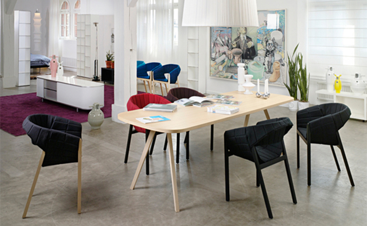 The armchair is a stylish piece of furniture that can change its appearance at will: the essential innovation of the armchair is its cushioning, which lies over the supporting structure like a ceiling. The precisely manufactured pieces of fabric are fastened with snap-buttons, which allows easy replacement and radical alternation of the chair's impact using colour changes. The base is made from minimal wood cross-sections and features the hallmark of Jörg Boner: an appearance that is both graceful and sturdy.