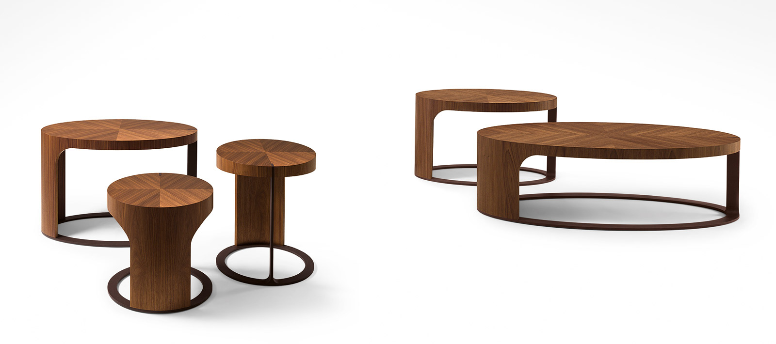 一系列的圆形或椭圆形咖啡桌结构在弯曲杨树胶合板、单板在核桃卡纳莱托木(fin.11)和青铜色金属画.