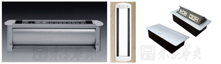 ※ 上图为会议台的过线系统介绍:可以选择如图的手动线盒、电动线盒、以及毛刷翻盖线盒,适合你不同的办公需要,内部可配置动功能三插电源孔、网络接口、耳机音频接口、话筒接口、VGA接口,也可根据客户实际需要选择和定做。