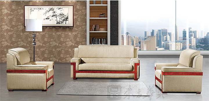 ※  上图为接待沙发的使用场景展示图,布面扶手,实木骨骼架,S型弹簧与超力橡筋交叉连接永久固定在木架上,不易变型。