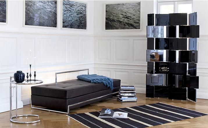 In the 1920s Eileen Gray experimented with various versions of the design of the Adjustable Table E 1027. As she changed the look of the table with a black metal top as an alternative to the crystal glass top, she also selected black as the colour for the frame. The matte black lacquer clearly emphasises the lines of the table and its form – a version she considered especially elegant. Together with Zeev Aram, Eileen Gray developed her Adjustable Table E 1027 for production in the 1970s; they both decided to produce the chrome-plated version first, with the intention to introduce the table frame in black at a later date.