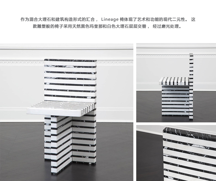 作为混合大理石和建筑构造形式的汇合,Lineage椅体现了艺术和功能的现代二元性。 这款雕塑般的椅子采用天然黑色玛奎那和白色大理石层层交替,经过磨光处理。