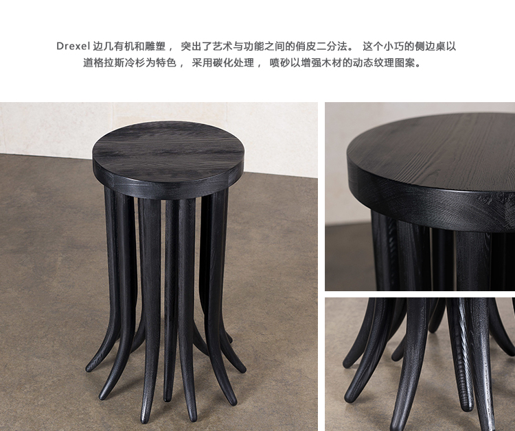 Drexel边几有机和雕塑,突出了艺术与功能之间的俏皮二分法。这个小巧的侧边桌以道格拉斯冷杉为特色,采用碳化处理,喷砂以增强木材的动态纹理图案。