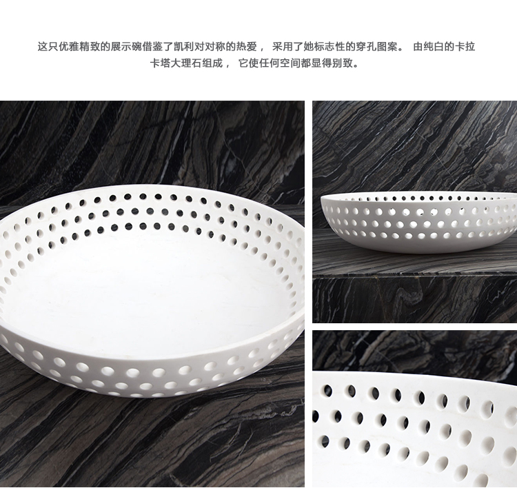 这只优雅精致的展示碗借鉴了凯利对对称的热爱,采用了她标志性的穿孔图案。由纯白的卡拉卡塔大理石组成,它使任何空间都显得别致。