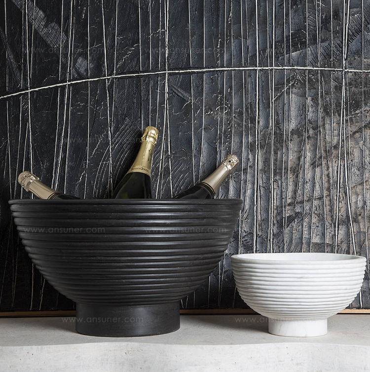 这款宽大比例的香槟碗采用坚固的大理石手工雕刻而成,并饰有柔软的罗纹外观。 其罗纹外观为碗提供了罕见的精致,大理石的优雅将与您的家居相得益彰。 每件作品都是独一无二的材料,旨在适应任何数量的娱乐功能和场合。 香槟酒杯可容纳冰块,最多可装四瓶香槟,食物安全。 大理石是一种天然材料,因此可以发生标记和着色的变化,使每个碗成为独一无二的。