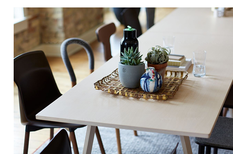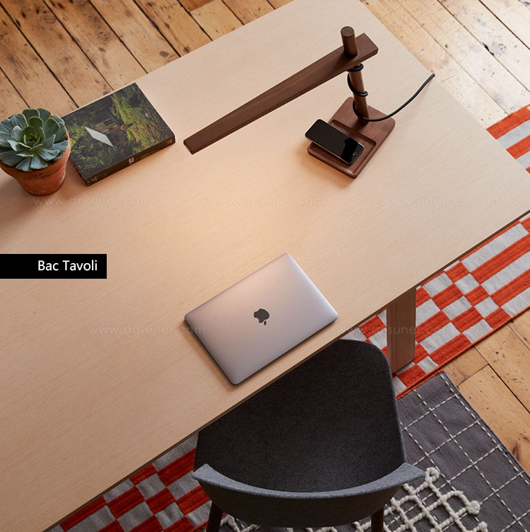 Bac桌由Jasper Morrison设计,由实木灰制成,表面经过漂白、翁染色、胡桃染色或上海蓝处理,或采用开孔漆灰(颜色:云、泥、木兰、橙色、灰绿色或中国蓝)。