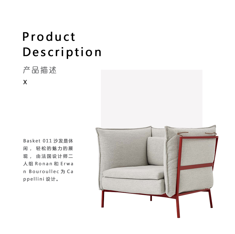 Basket 011沙发是休闲,轻松的魅力的展现,由法国设计师二人组Ronan和Erwan Bouroullec为Cappellini设计。 该系列由一个双人沙发和三人沙发以及宽大的扶手椅组成,为您提供了经典和流行色彩配对的机会。
