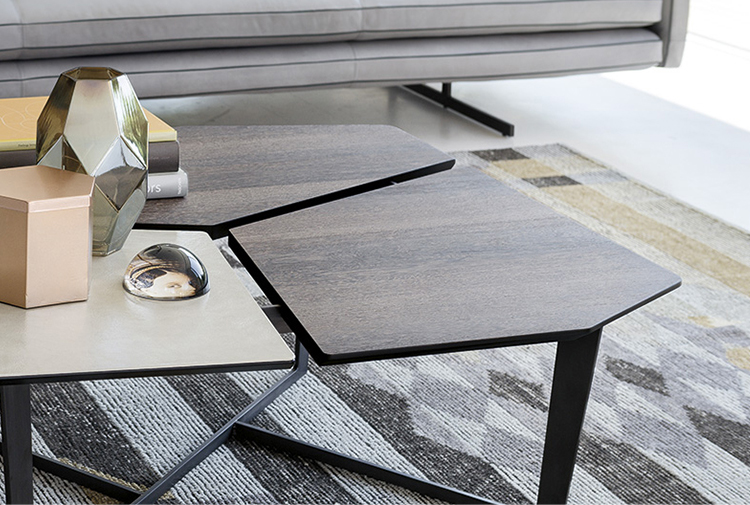 纳尔逊咖啡桌的主要特点是它的桌面。桌面被一个很深的缝隙分开但它们是由结构组成的。将木头和皮革等温暖的材料结合在一起组合成了不规则的几何形状的桌面。托斯卡纳传统的蔬菜鞣革是一种以多种颜色、独特香气和小瑕疵为特点的天然产物。