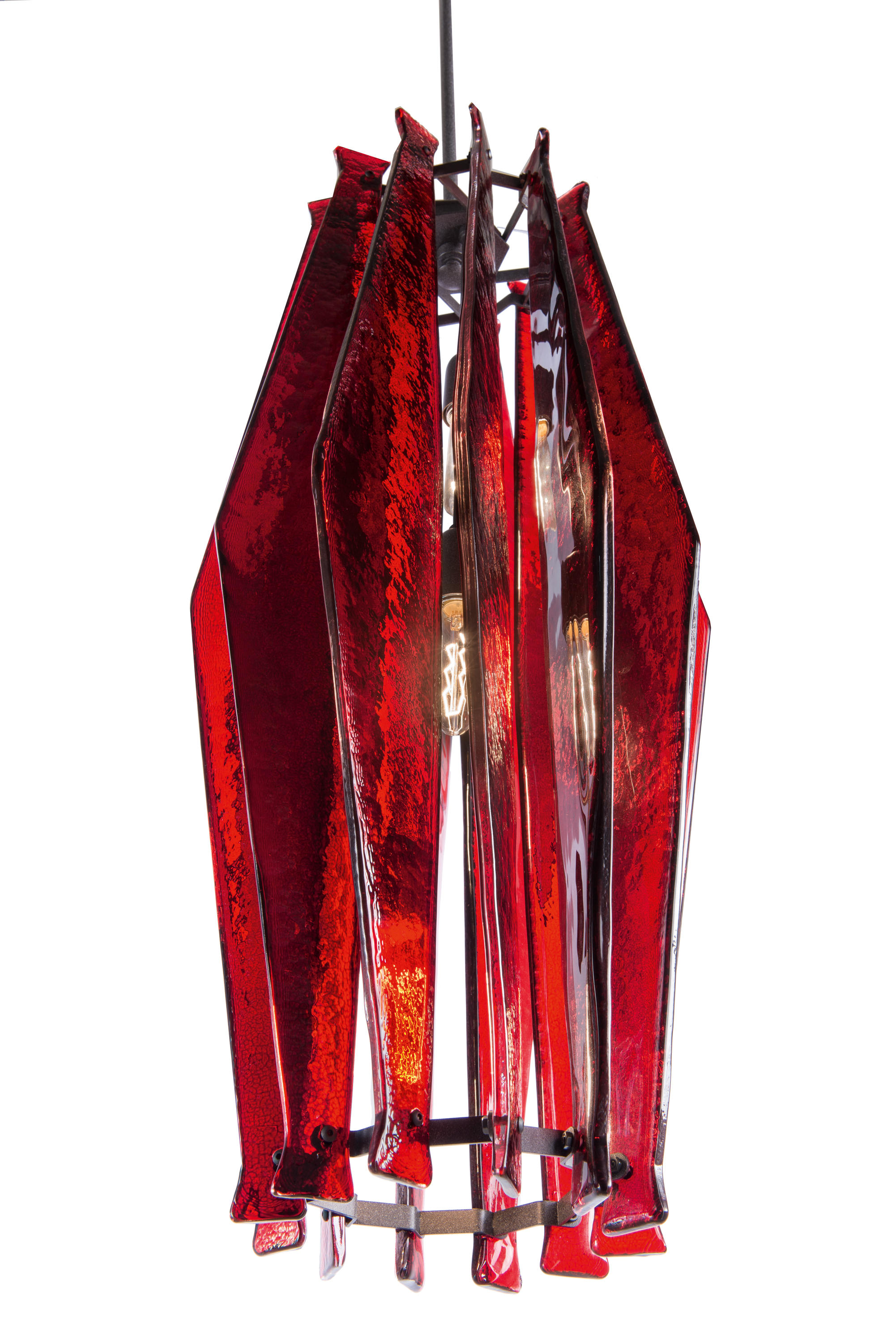 oompa-loompa灯的特点是有几条带着径向定位的带斑点的玻璃,就像许多小型的“oompa-loompas”正在跳舞一样。光线透过玻璃和空的空间扩散,创造出几束光线,营造出壮观的环境。该系列包括一个悬挂的版本,有青铜色、蓝绿色和红宝石色三种不同颜色;和一盏落地灯。金属部分是云母棕色的钛。