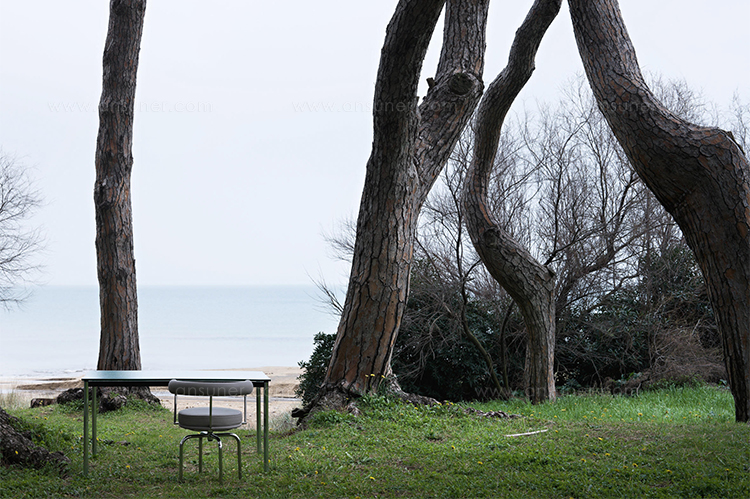 1984年改版的Charlotte Perriand LC10桌子。CR3三价镀铬钢结构涂哑光漆,有多种色彩选择:灰、淡蓝、绿、棕,泥土和象牙或黑色。玻璃台面有透明和纹理两种,15mm厚。也有户外版本。长宽高120x80x70cm, 看起来像是1929年巴黎秋季沙龙中参展的桌子,“居室的装置”的一部分。这款桌子最大地简化了框架,镀铬管状桌腿和喷漆的边饰都很极简,金属处理的表现力实现了桌子的完美效果。