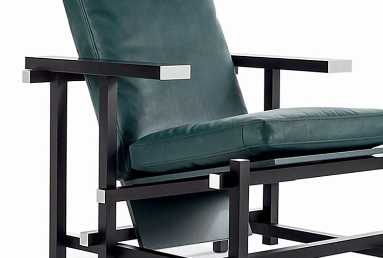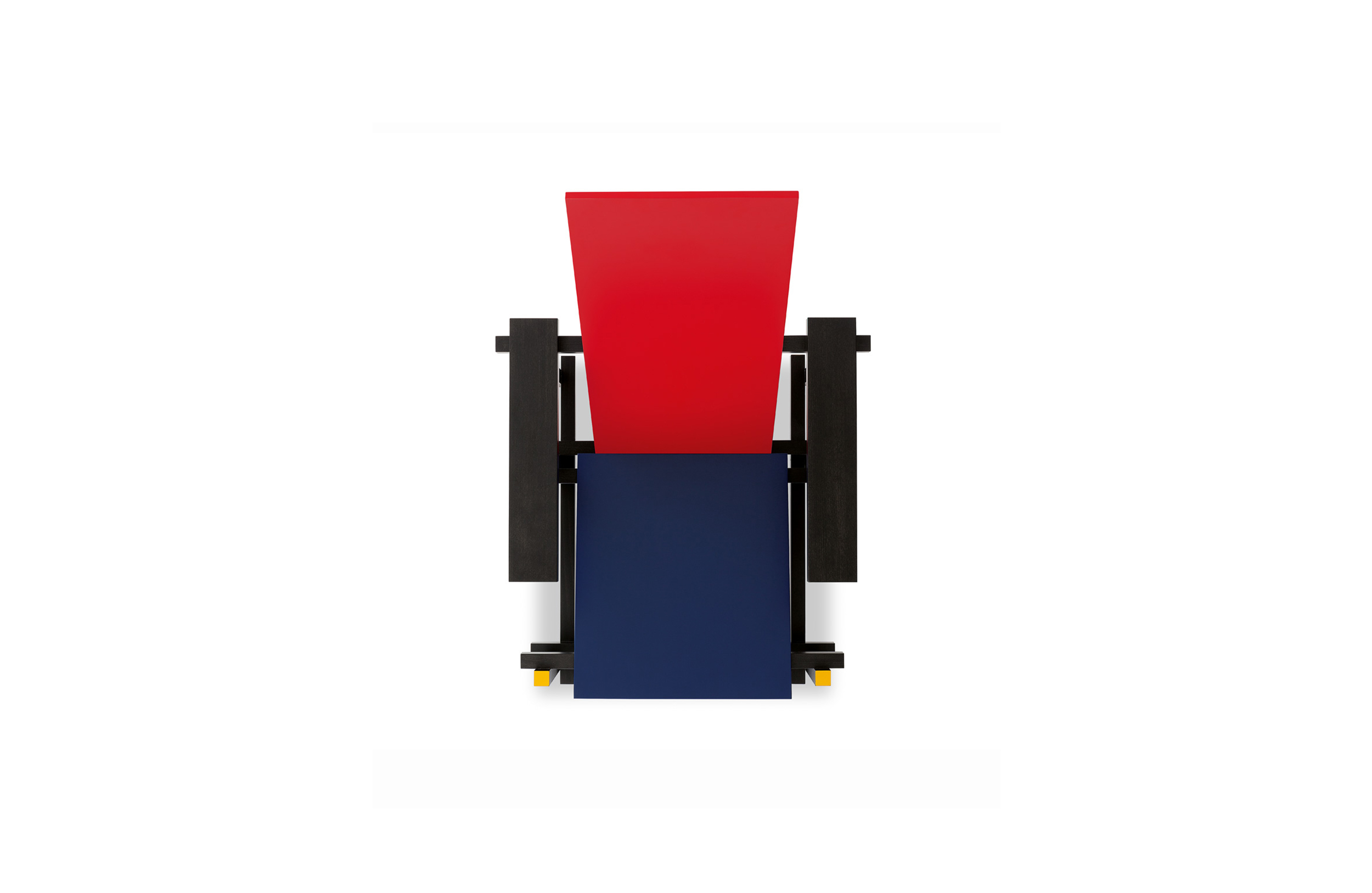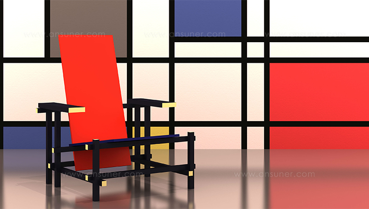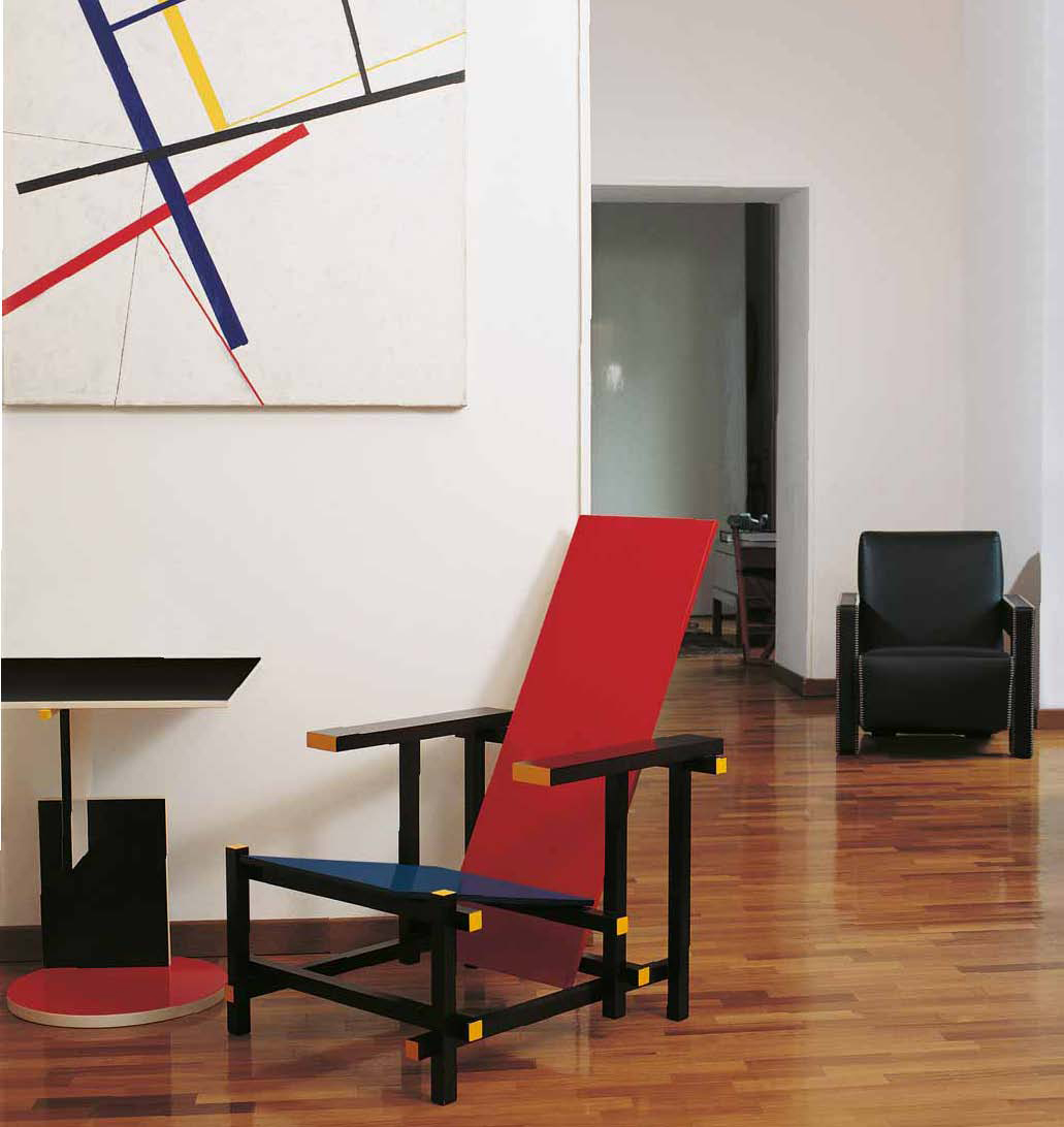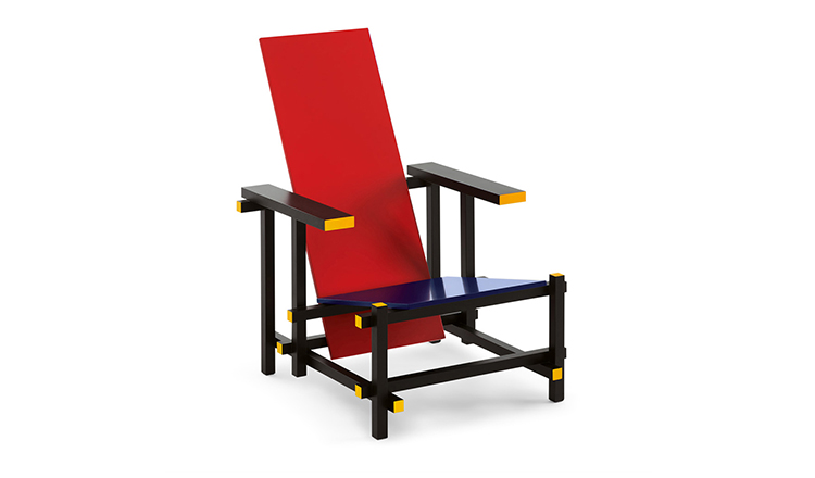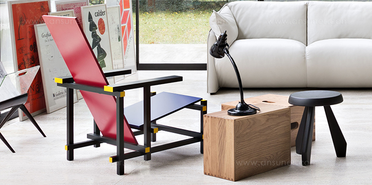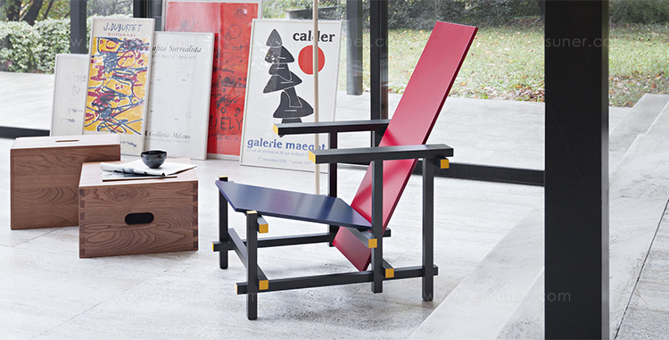 经典的红蓝椅是一款躺椅。框架采用黑榉木制造。座面(蓝色)和椅背(红色)采用涂漆胶合板制造。微妙地玩转了水平和垂直线,这款造型独特的椅子成为荷兰风格主义的宣言。该款椅子框架的所有部分重叠地组装在一起,而不是使用接缝组装。该设计的主要颜色是向蒙德里安绘画致敬,框架为红色、蓝色、黄色和黑色,划分除了具体功能的不同部件。