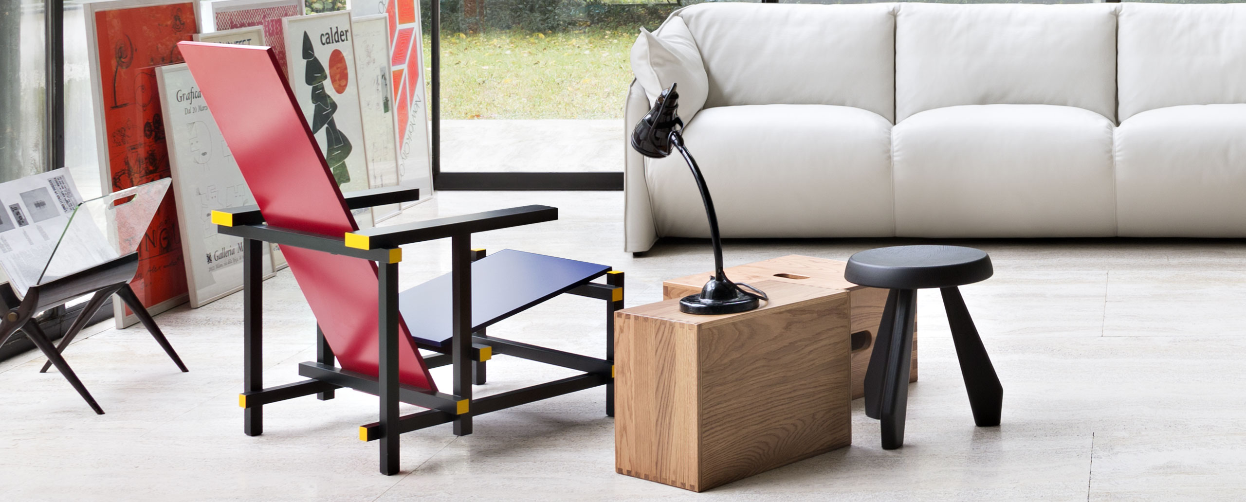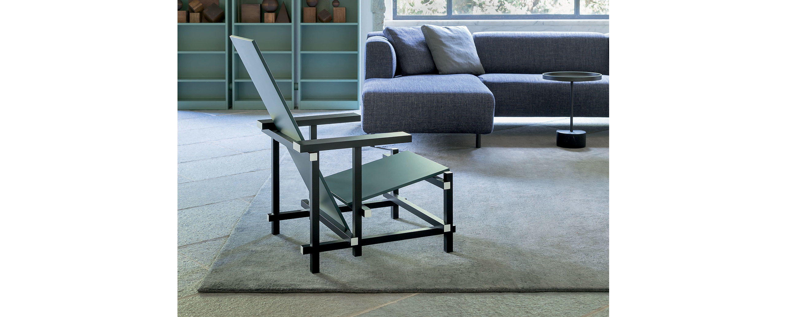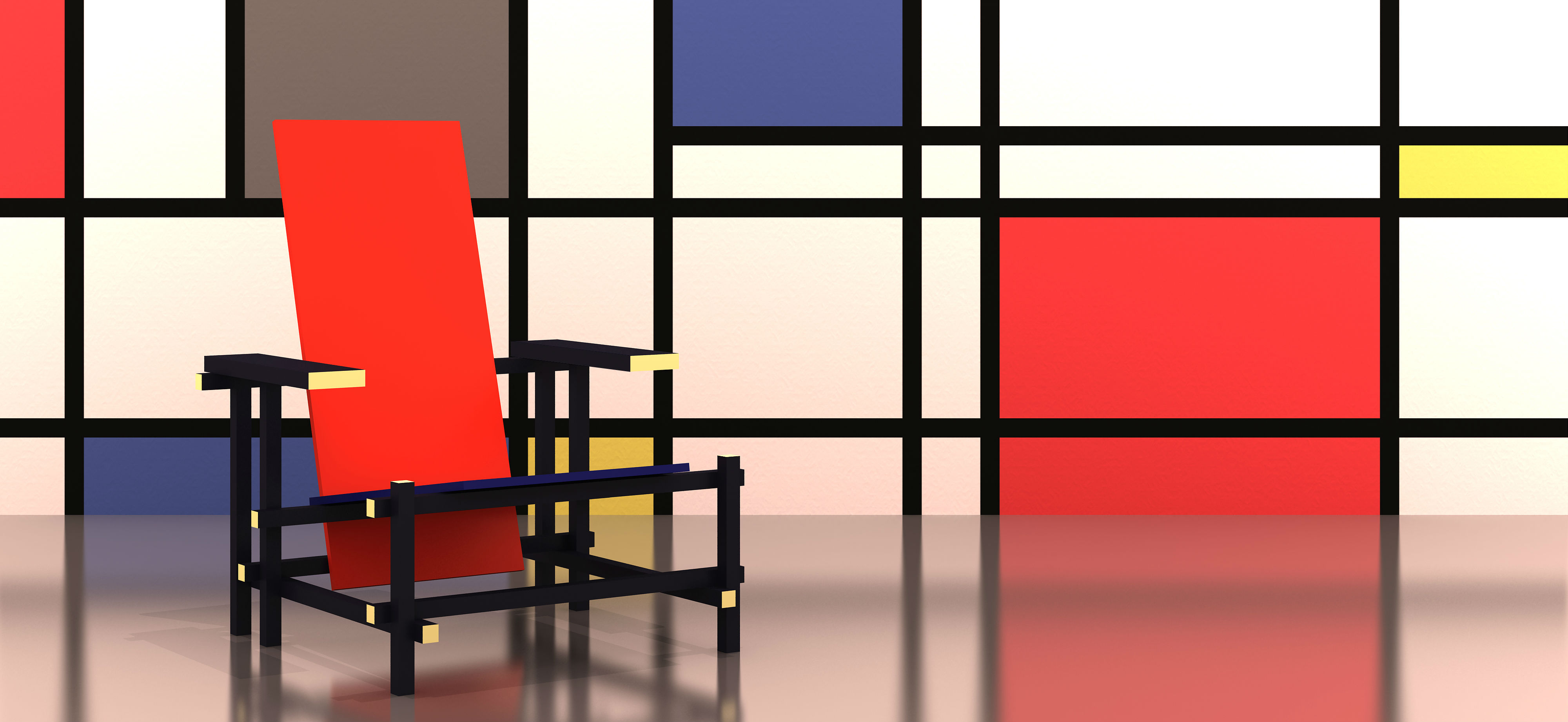 经典的红蓝椅是一款躺椅。框架采用黑榉木制造。座面(蓝色)和椅背(红色)采用涂漆胶合板制造。微妙地玩转了水平和垂直线,这款造型独特的椅子成为荷兰风格主义的宣言。该款椅子框架的所有部分重叠地组装在一起,而不是使用接缝组装。该设计的主要颜色是向蒙德里安绘画致敬,框架为红色、蓝色、黄色和黑色,划分除了具体功能的不同部件。