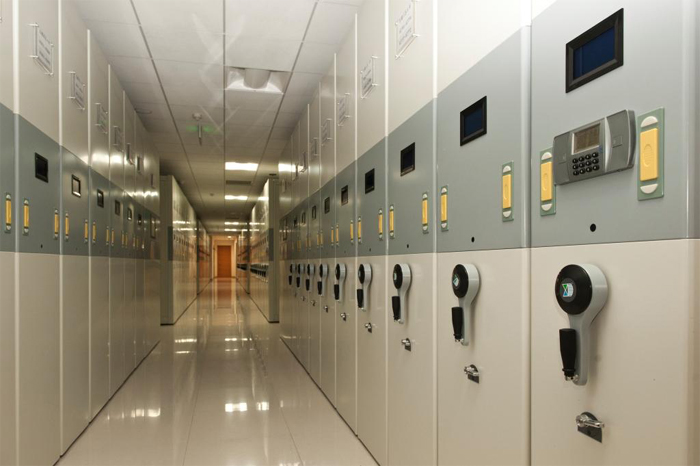 1、智能密集柜完备的计算机通讯功能,不但能通过计算机对各分区、列进行灵活操控,并可从密集架上对各分区、列进行操作。