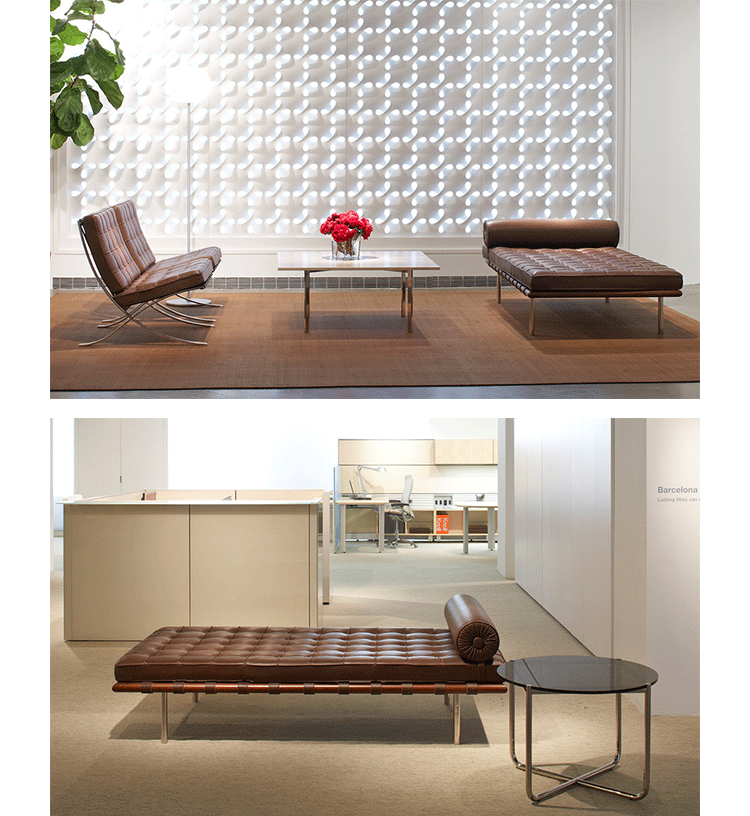 德国建筑大师Ludwig Mies van der Rohe于1929 年巴塞罗那万国博览会为德国设计德国馆,不仅设计建筑物,对于建筑物中的家具及细部家饰均非常重视的Mies van der Rohe,为了当时的西班牙国王 Alfonso 三世及皇后的大驾光临,而设计了有名的 Barcelona chair。巴塞罗那沙发床(Barcelona couch)是巴塞罗那系列产品之一,运用实木的架子,不锈钢的脚支撑配合格子状的皮革缝制,亦展现了高超的缝制技术。巴塞罗那沙发床可作为日间小憩的理想之选。
