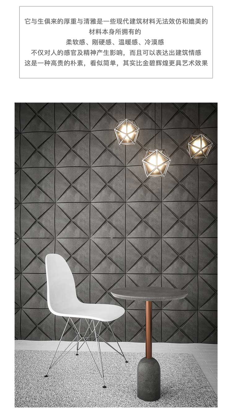 它与生俱来的厚重与清雅是一些现代建筑材料无法效仿和媲美的材料本身所拥有的柔软感、刚硬感、温暖感、冷漠感不仅对人的感官及精神产生影晌,而且可以表达出建筑情感这是一种高贵的朴素,看似简单,其实比金碧辉煌更具艺术效果。