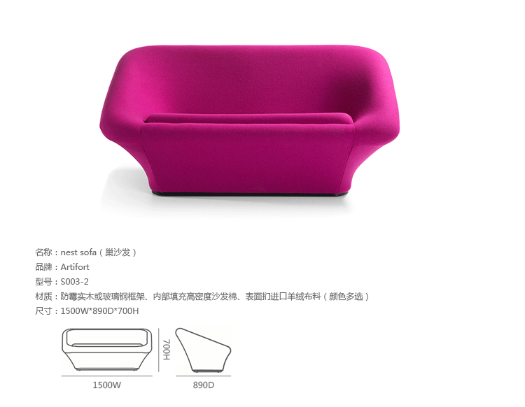 Artifort为其悠久的历史感到骄傲,在 2014 年,Artifort将Pierre Paulin经典的设计F564 和 C565重新带回家具舞台,我们称之为‘Nest’系列,Artifort深受喜爱系列之一。美丽流畅的线形,提供舒适的坐垫。它是有点复古,非常迷人,柔软,和亲切。‘Nest’造型就像一个蘑菇,制作采用防霉实木或玻璃钢框架、内部填充高密度沙发棉、表面扪进口羊绒布料(颜色多选)。