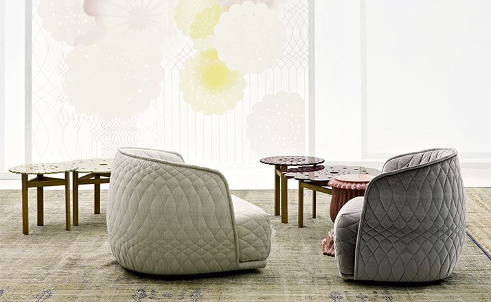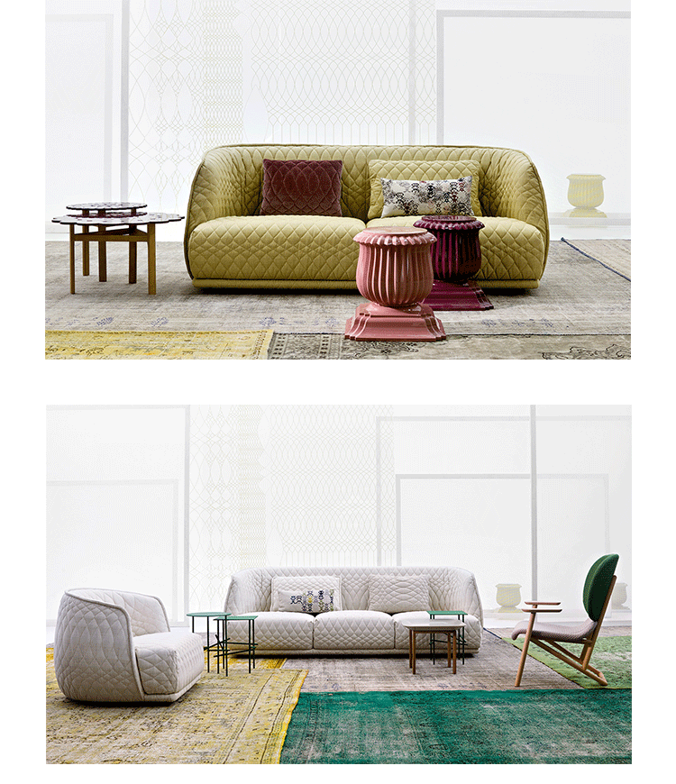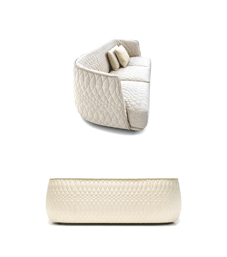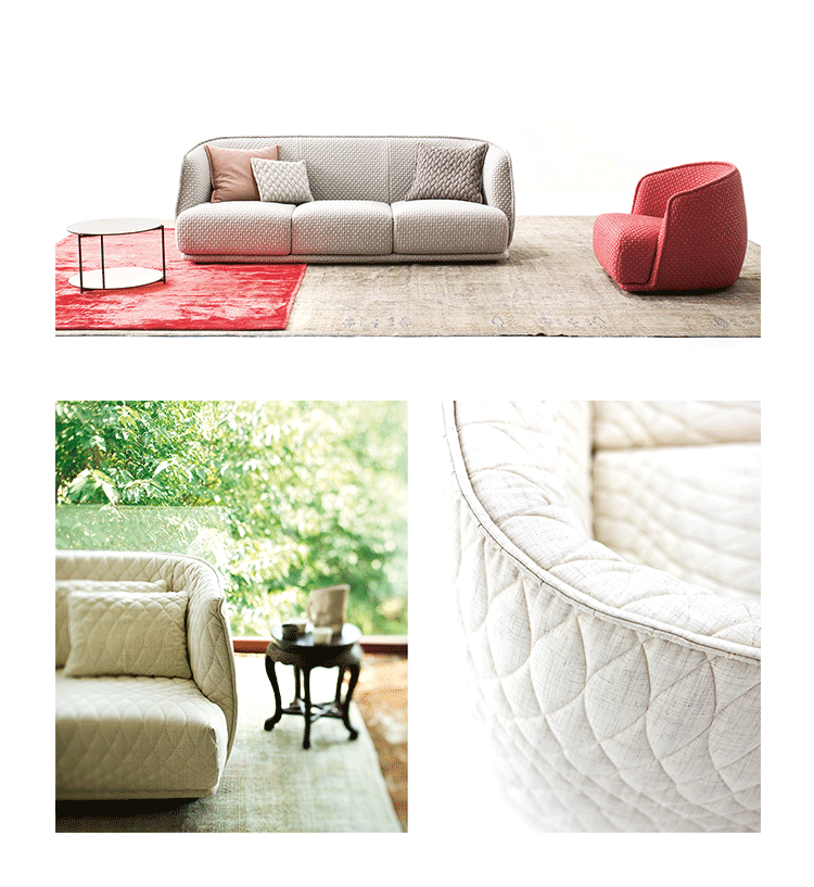 Redondo is a set of seating elements designed by Patricia Urquiola for Moroso.Its distinctive theme is roundness,and indeed the name in Spanish means“round”.The system comprises a sofa and two snug armchairs that evoke an almost "protective" intimacy.The line and form of the structure are reminiscent of a brandy glass:it consists of two adjoining volumes that together form a cocooning seat, like a shell.It does not require the addition of numerous cushions.Redondo's curved shapes are accentuated by the complete absence of corners and by the soft fabric,chosen to offer sensory stimulation,and embellished with a quilted decoration in which the thread,like a pencil,draws elegant three-dimensional geometries.