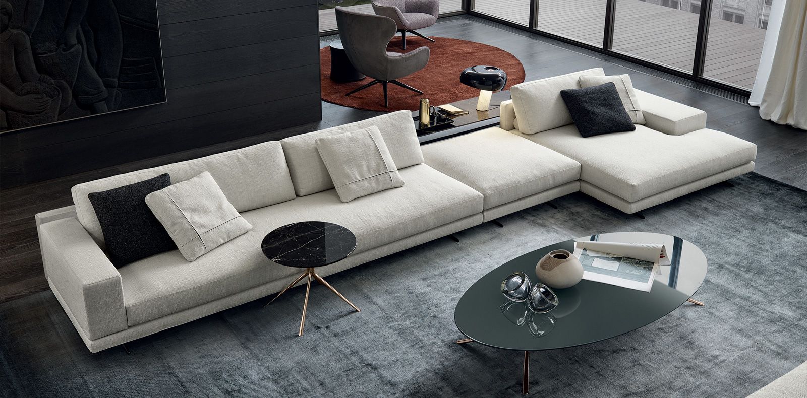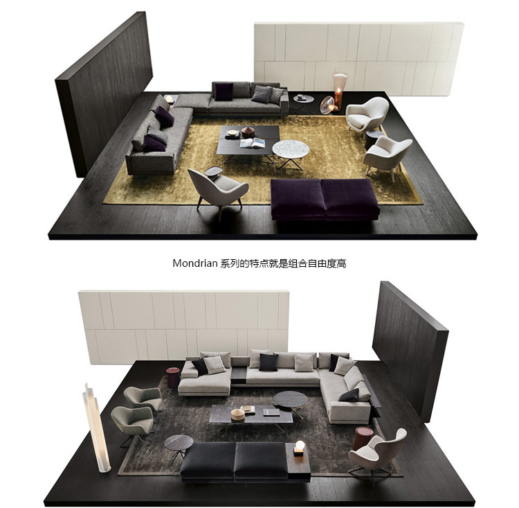 蒙德里安架由弹性垫与沙发的角落,druckgegossenem聚氨酯和可拆卸的外部方面,由织物或皮革。回来的枕头座和柔性聚氨酯由不同硬度的铅笔。木扶手在马特或光泽黑色版本的榆树,色漆。木制靠背架,并在演讲或光泽黑色或哑光榆树的颜色漆。镍的metallfüße布朗马特或光泽清漆。蒙德里安提供最大的自由,因为所有的元素与不同的大小不同的配件,坐垫和靠背,手臂用板(也可从木材)可以安装。