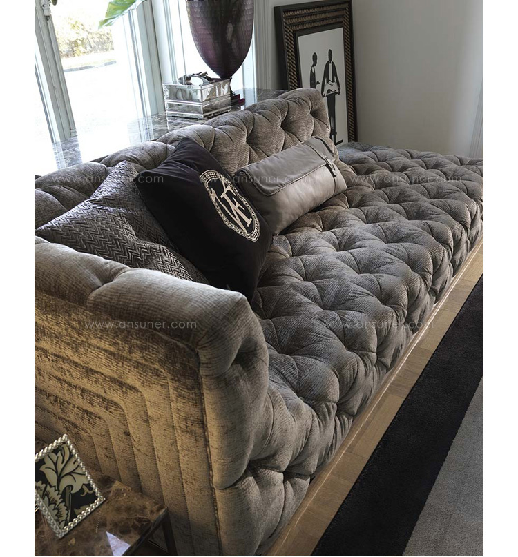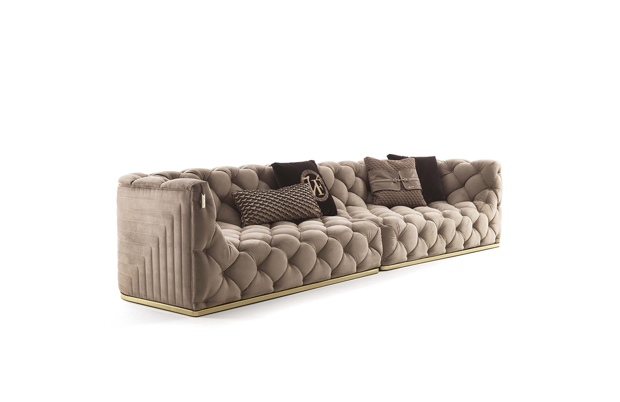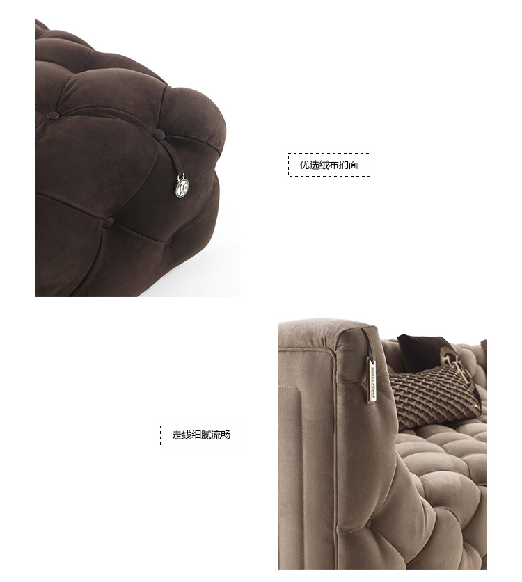 沙发表面覆盖皮革,基底颜色是黄金色,按扣在同一材料的封面.