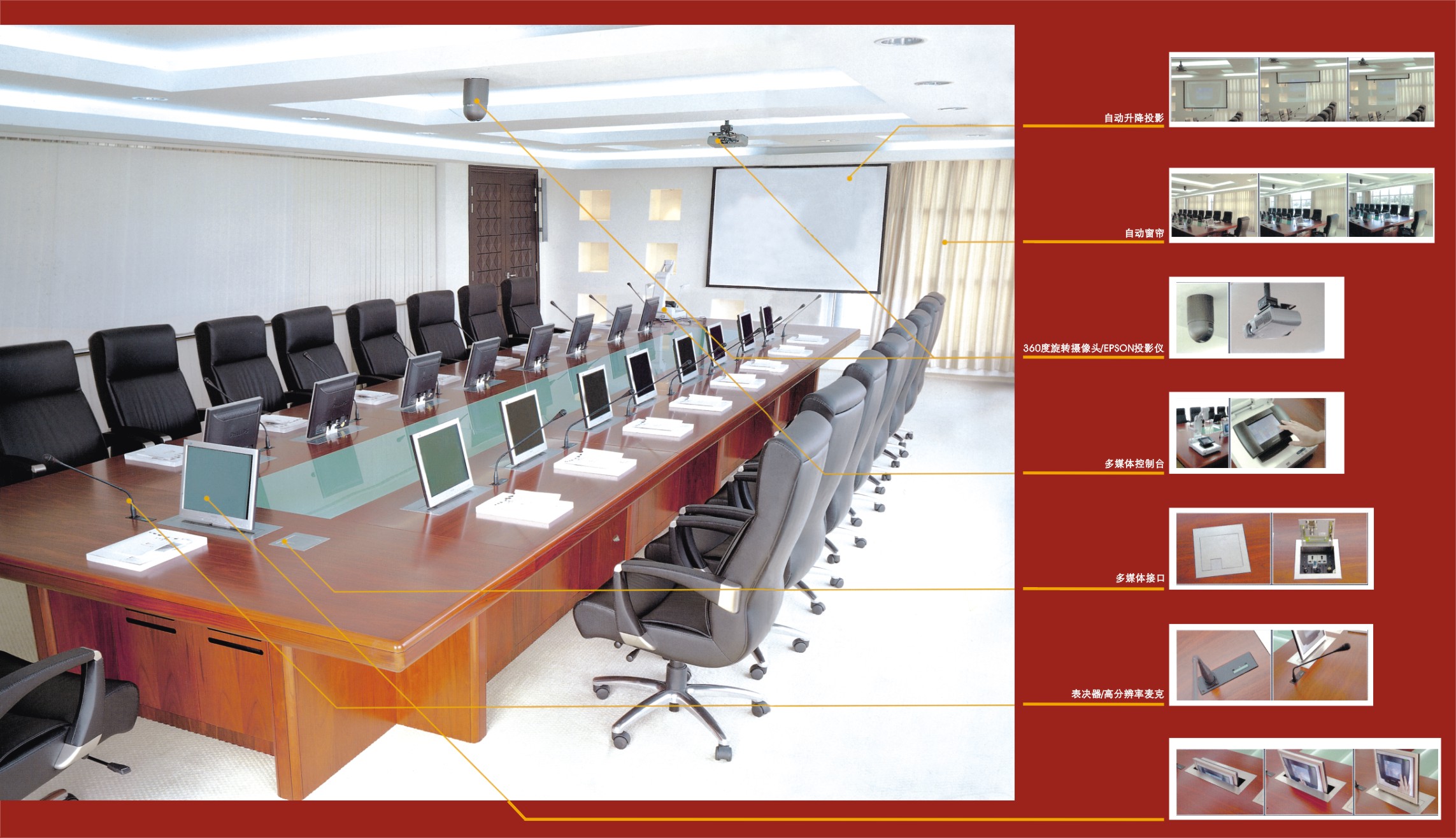 ※    多媒体会议桌,把自然的质感展现再次,柚木、胡桃木的实木工艺表现,让自然的概念在您的雅域表现出来;现代办公空间中的自然色彩,为您的办公室写上自信与自在!