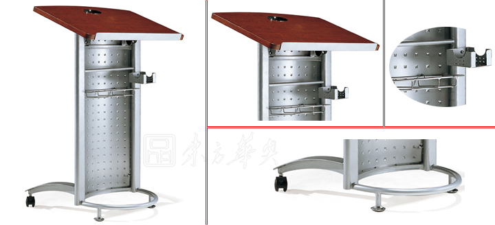 ※  上图为演讲台正面,背面的展示图,宝钢一级冷轧钢板制成,喷涂工艺,面板是实木铁皮面,活动脚轮和固定脚轮组合!