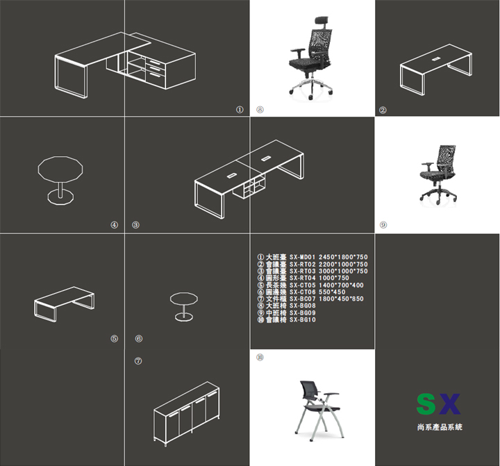 ※ 尚系产品中不同配置,其中包括班台、会议桌、文件柜、洽谈桌茶几等系统配套产品