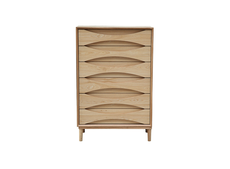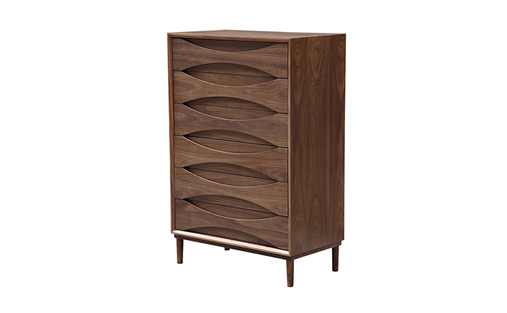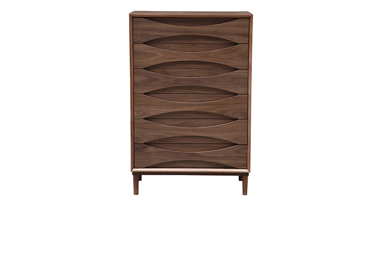 arne vodder retro tall boy dresser(arne vodder复古高男孩梳妆台)是Kardiel公司制作的经典实木家具,具有世纪中期的现代风格,6个滑动式抽屉通过精心制作,提供足够的空间存放衣物或其他物品。在现代主义的存储家具上, Finn Juhl和 Arne Vodder 最先尝试胶木和天然木的组合运用。这是大胆的创新,他们结合传统的新鲜的新兴技术与现代主义的概念。制作采用精选MDF板基材胡桃木或水曲柳木皮贴面、胡桃实木或水曲柳实木脚架、环保油漆喷涂、做工精湛。