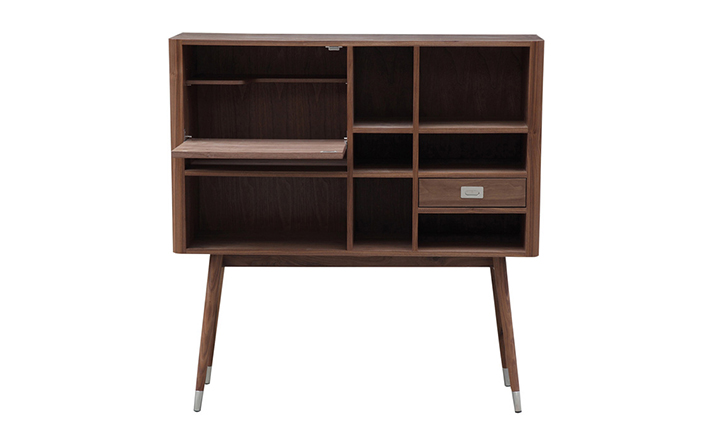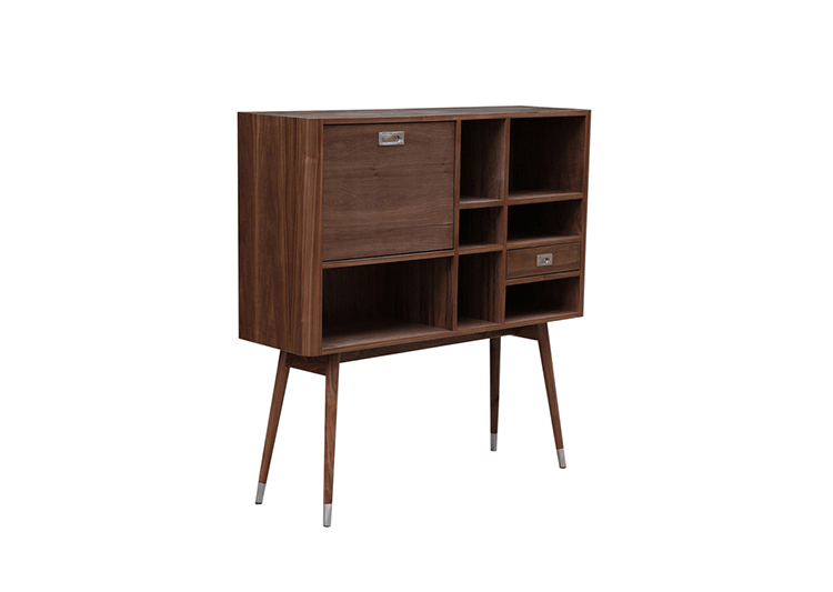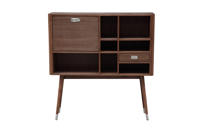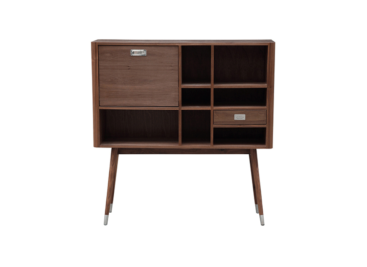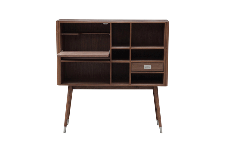 elroy retro upright credenza(埃尔罗伊复古立式书柜)是Kardiel公司制作的经典实木家具,1960年设计,是一件不朽的设。这个当代复古立式书柜有着高高的脚架,多个滑动抽柜和开放式抽屉。它允许“公开展示”和“隐蔽”所有类型的珍惜贵重物品的存储物。不锈钢装饰抽屉拉手和基部的尖尖的脚钉。