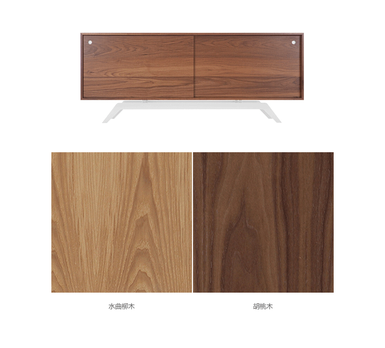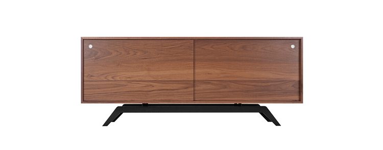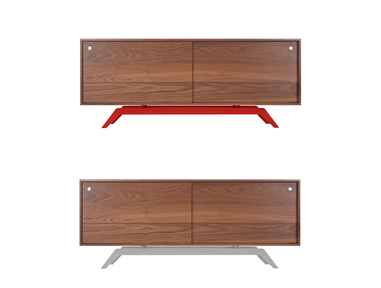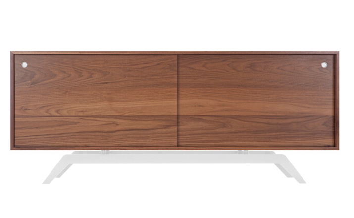"The sleek base is laser cut and powder coated in one of 6 color options.The box is handcrafted of solid wood with reinforced mitered joints allowing the wood grain to wrap around the entire piece.Behind the smooth sliding doors are adjustable shelves and wire passages that make it a simple and flexible place for all of your media needs,wired and unwired."