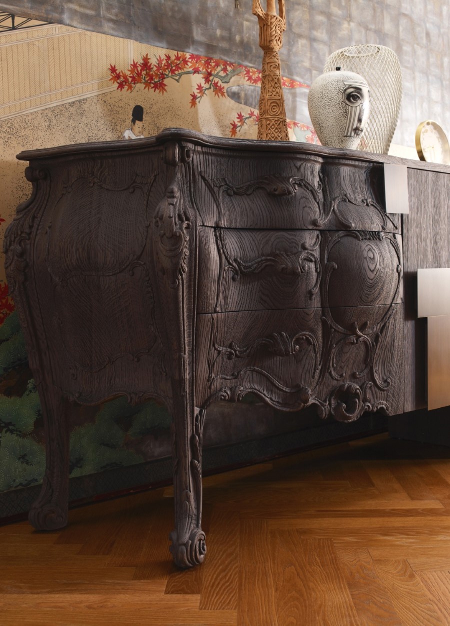 Italian Emmemobili launches the sideboard Evolution, combining old and new woodcraft. The classical side is in solid oak wood joint to the structure with doors in oak veneer. The whole sideboard has sandblasted wooden structure, handles in burnished brass and finishing in sanded oak